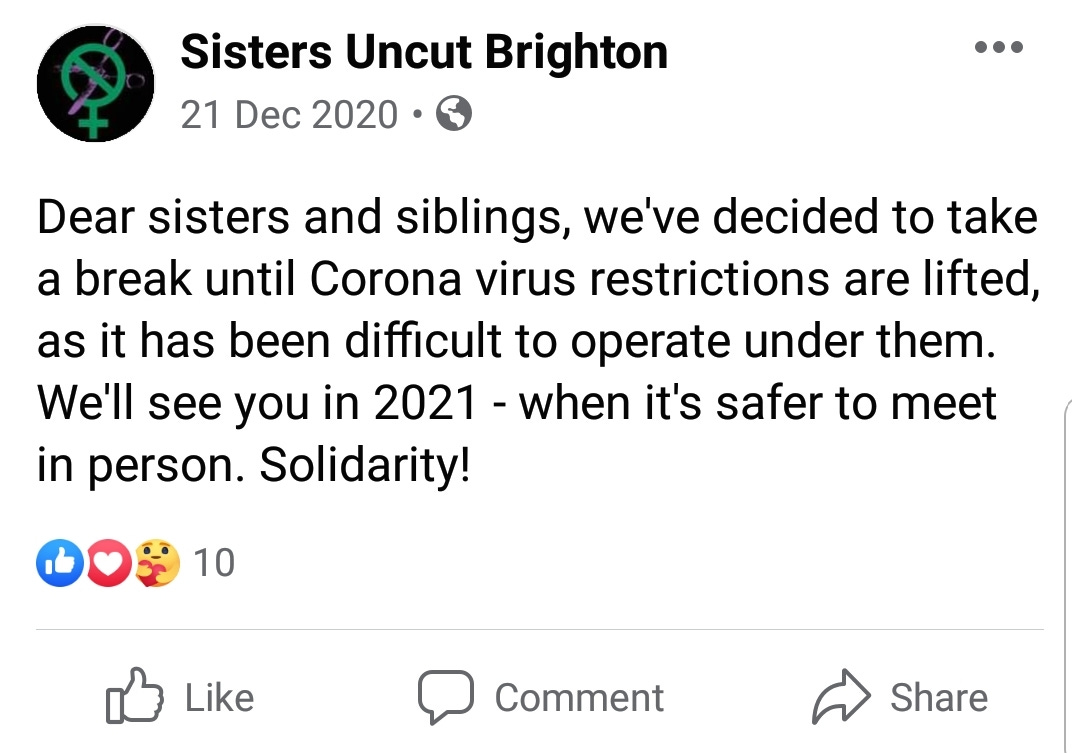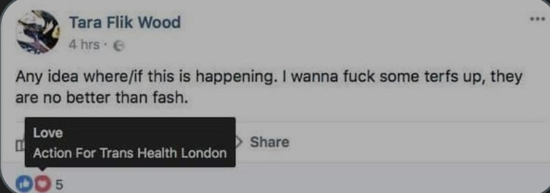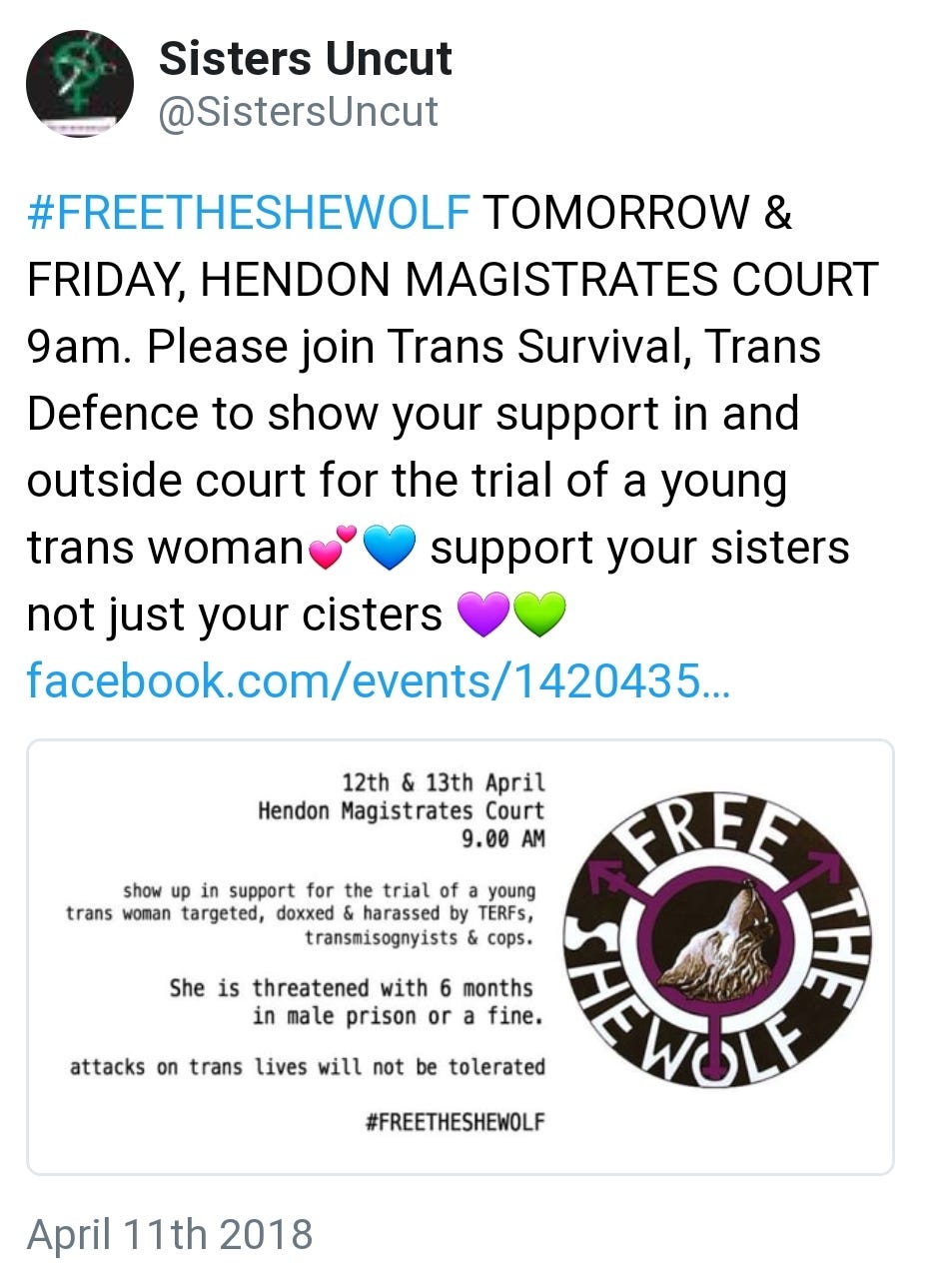 Sisters Uncut supported Peyton Rose (a livid rook with beak and feather disease) who threatened to ‘throat punch’ women who dared put stickers up defending same sex care and spaces. They rallied around violent (balding), 6 foot 2″ and 26 year male ‘Tara’ Wolf in the aftermath of his (and two unidentified male friends) attack on Maria McLaughlin, a 60 yr old feminist attacked by Wolf and others at speakers corner in Hyde park.