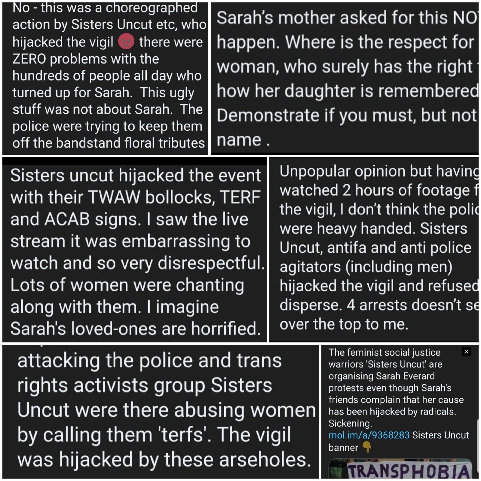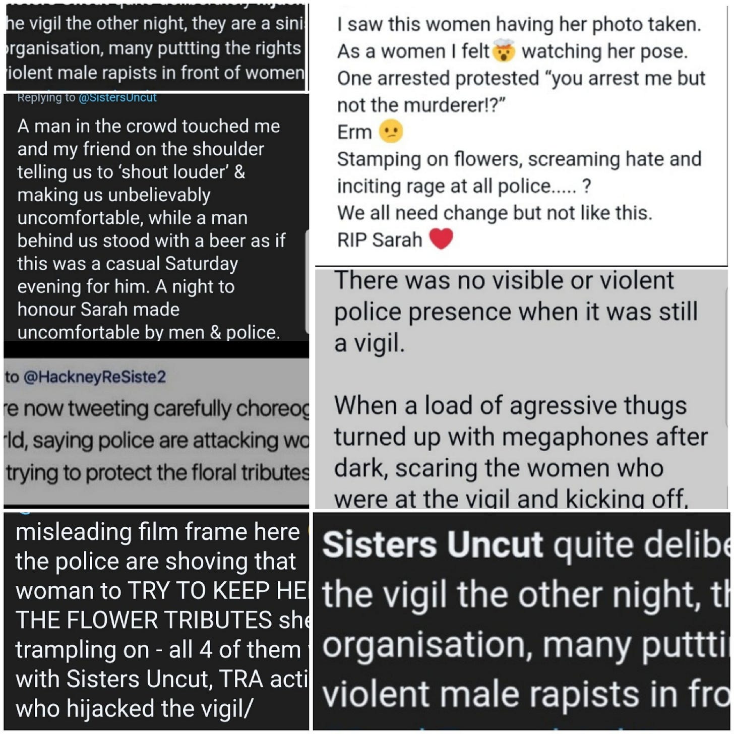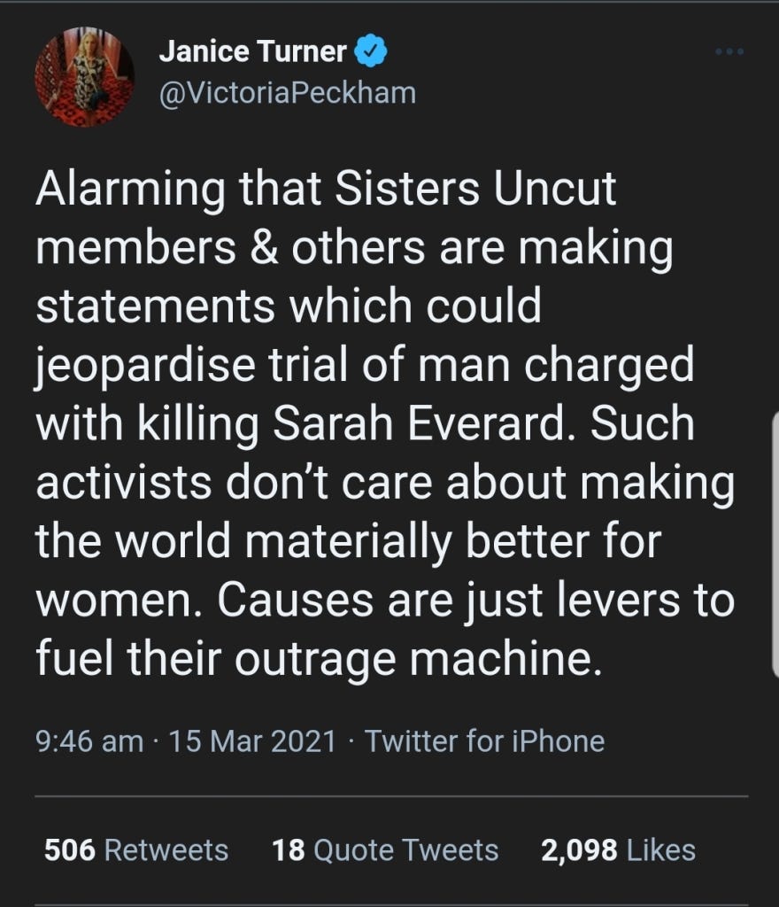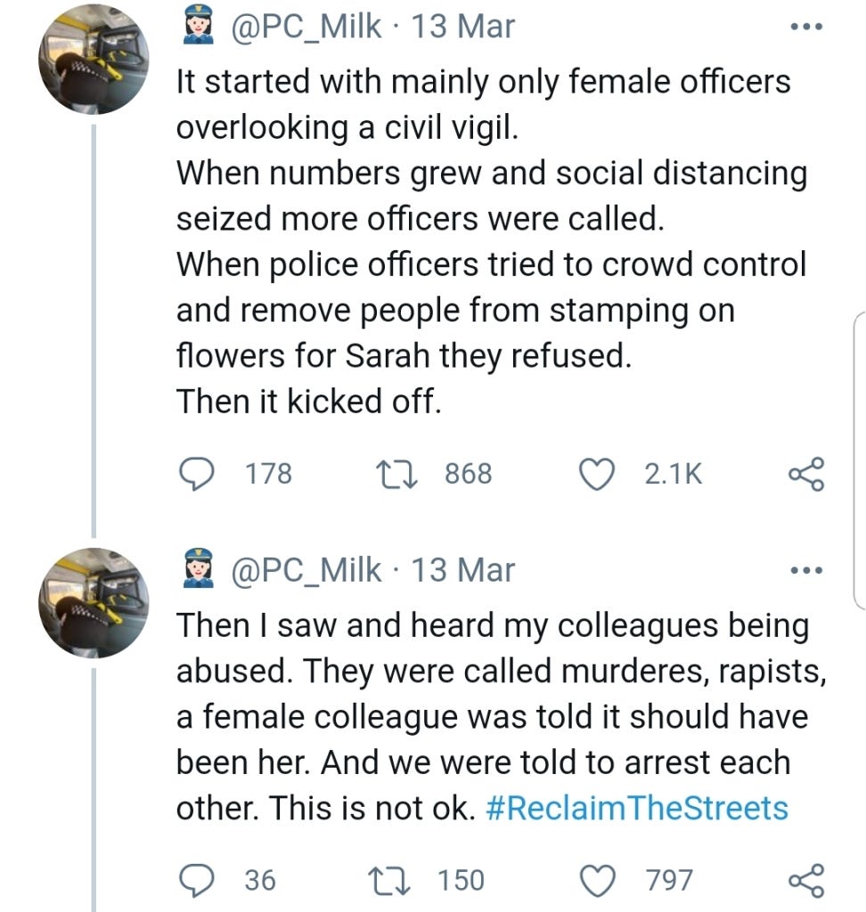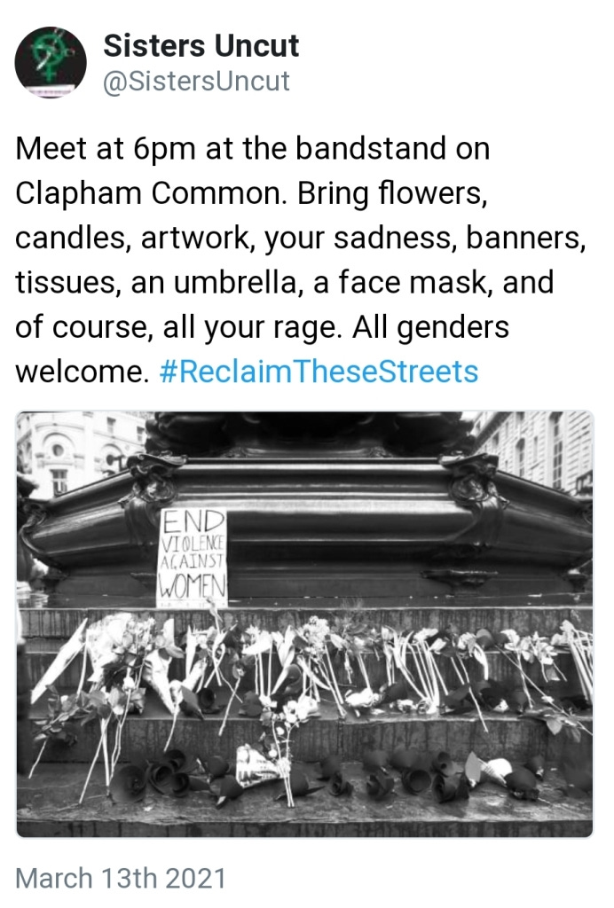 Excellent piece. I went to the vigil, I was going to go anyway, I live less than a mile away. I went to remember Sarah, I went for every woman I’ve known who has been subjected to male violence including my mom, my sisters, my self, my 9 year old niece, for the 2 year old girl I worked with who had cigarettes stubbed out on her…for every single one. As I got closer to the common I could here a man on a loudspeaker, and then I saw man after man all dressed in black, carrying their beers around as you very rightly describe. I took my dog because I don’t feel safe on my own and having my dog with me is the only way I can suppress my PTSD enough to be out on my own. I also noticed the very light touch of police and that male officers couldn’t even look at you. I stayed on the periphery cos I’m vulnerable to covid and had my dog. I found myself near the press and listening to them talk about anything but the vigil of Sarah, one of them was going to ‘shift off soon’ as ‘there was nothing to see’ the chanting being directed by a man was growing louder and all I could see were compliant women being directed by a man. The chanting got more and more aggressive and being an old hand at protests and demonstrations I saw the police slowly moving in and that I’m afraid was the signal for me to leave. I hadn’t managed to light a candle or put some flowers down but knew what was coming and I wasnt there for that and certainly not at the behest of a load of men and their enablers. So I left and cried silently all the way home, years of rage and sadness that this shit will never end and it certainly never will when the likes of Sisters Uncut hijack violence against women for their own political agenda and aims. It was sad spectacle and my thoughts and sympathies go with Sarah’s family and friends and I’m sorry for their loss and the disgraceful way her death has been used by people who care for nothing but themselves.