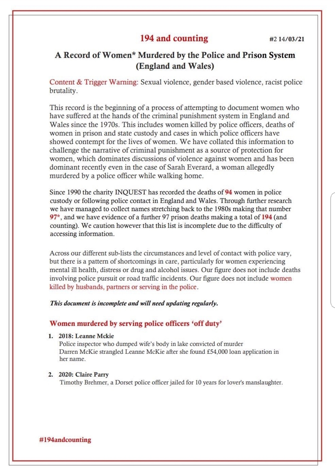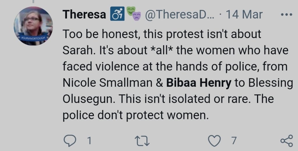 And while Sarah Everard is their cause célèbre victim of state violence, the consistent angle to their statements, the words of their followers, gives a critique of her media presence and interest as a lucky consequence of her being an archetypal, photogenic victim that is most mourned by the press; ie blonde, white, middle class.
