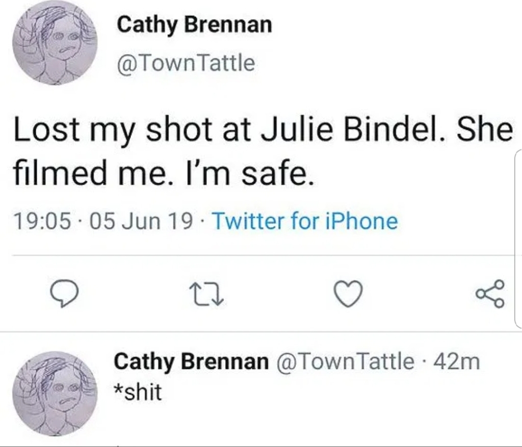 I got very drunk later that evening. I was loud, I’m sure I never looked like the ‘perfect’ victim. I know that we respond in hugely varied ways. Still, I see nothing but a calm performer in Patsy, who reactivated her Twitter account the same evening, railed about the dangers faced by “all women, including trans and non-binary” and laughs on the video.