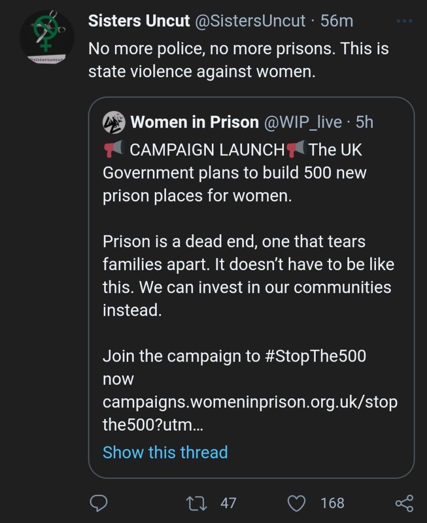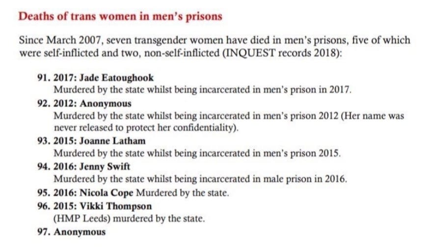 four trans identifying males / transwomen are vulnerable within the male estate, especially the very young like Thompson, and I’m wholeheartedly behind the introduction of specialist wings for trans prisoners, and better emotional support and access to rehabilitation for all prisoners. But what do we do with the Jade Eatoughs, the Jenny Swifts and Nicola Copes of the world if we abolish prisons? Moreso, why are they listed in memorial alongside a woman who was brutally assaulted by immigration police and restrained til she died, and what do the type of male who attack women as they walk home, who rape little children, have to do with the death of Sarah Everard? Give SU what they want, and we will only suffer more atrocities.