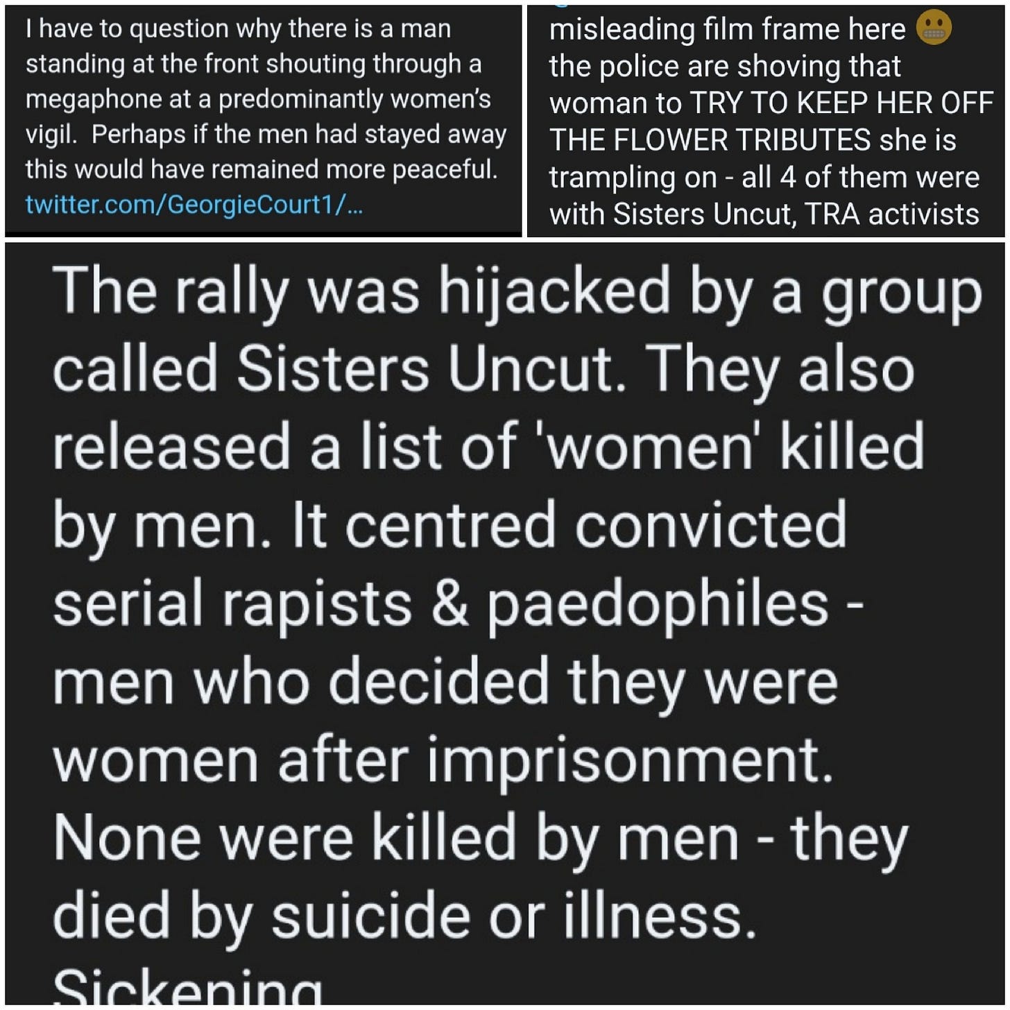 To lay claim to a woman’s murder, start issuing orders as to who is and is not welcome, pontificate on the systemic causes, demand abolition of the prisons, police, but still refuse to allow women to identify their most serious threat – males – and hijack a vigil is predatory, expedient narcissism of mammoth proportions.