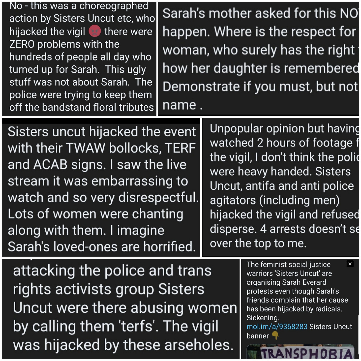 People from various movements emerged, and some decided it was their moment to claim authority over a memorial for a murdered woman. That meant obscuring her, under a list of demands and accusations. Who knows what Sarah’s beliefs were? Certainly, SU don’t give a fuck.