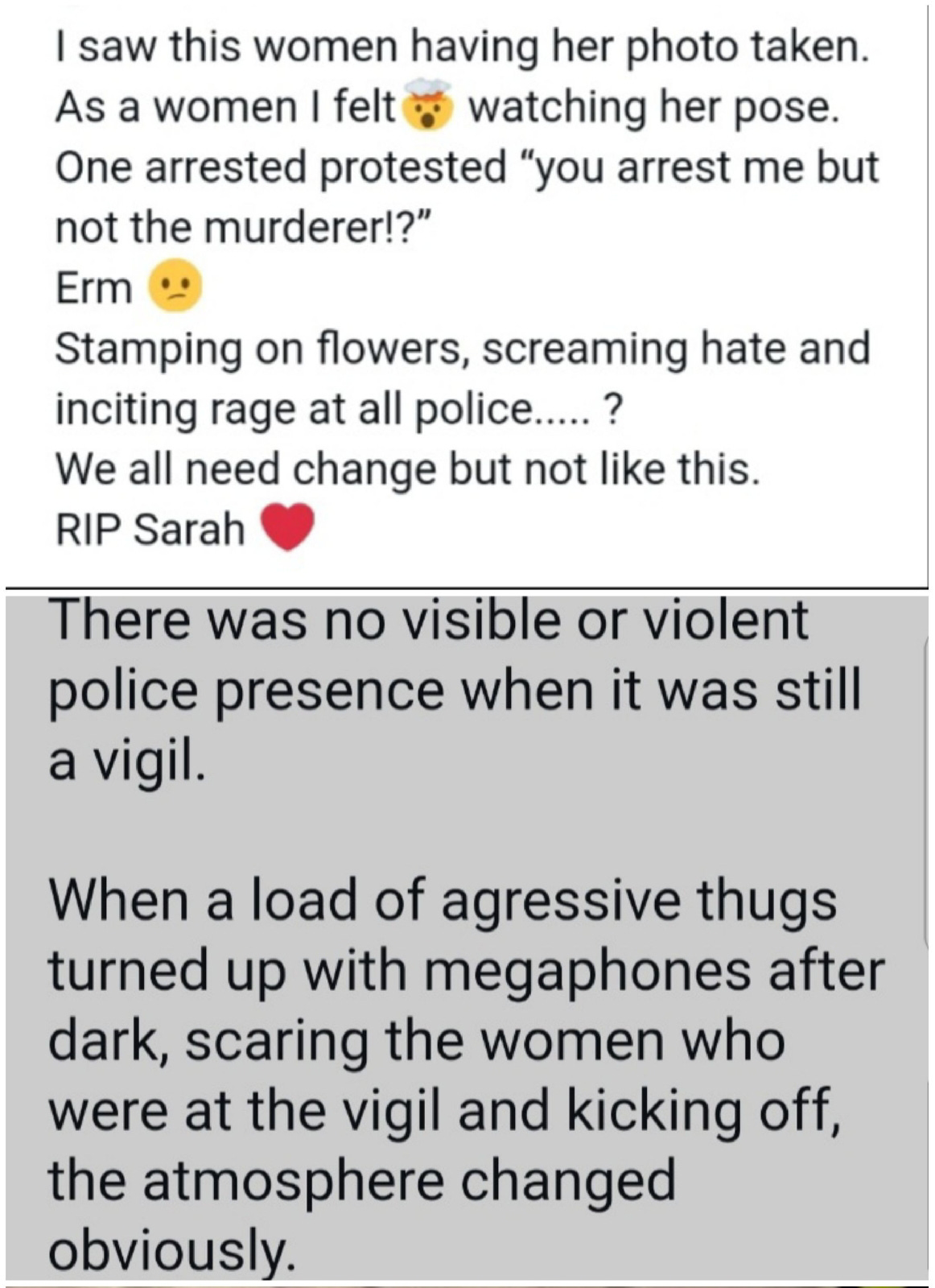 So, in they swoop, laying down the law on who was allowed to grieve, in public, at a memorial site built from instinctive and unbidden public grief. Chanting that all cops are bastards from loud speakers, someone sprayed ACAB on a police van, another smashed the wing mirrors. Men arrived and started shouting, shoving and scrapping. The atmosphere turned. Sarah’s murder was overshadowed by rallying cries about defunding and arrest the police, a lot of stuff about black trans women, ‘trans women are women’ and kill the bill (against protests). What a lovely vigil – who wouldn’t want to be remembered like this?